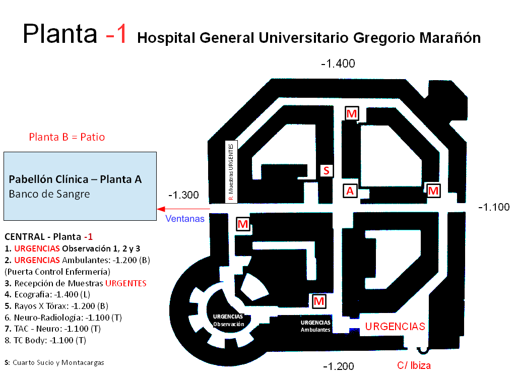 Hospital General Universitario Gregorio Marañón: Planta -1 (semisótano) del Pabellón CENTRAL o Médico Quirúrgico.